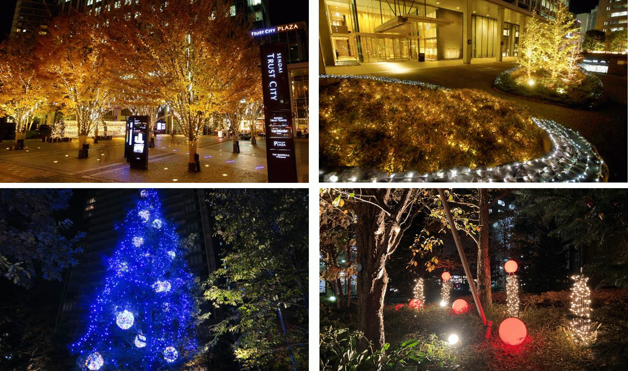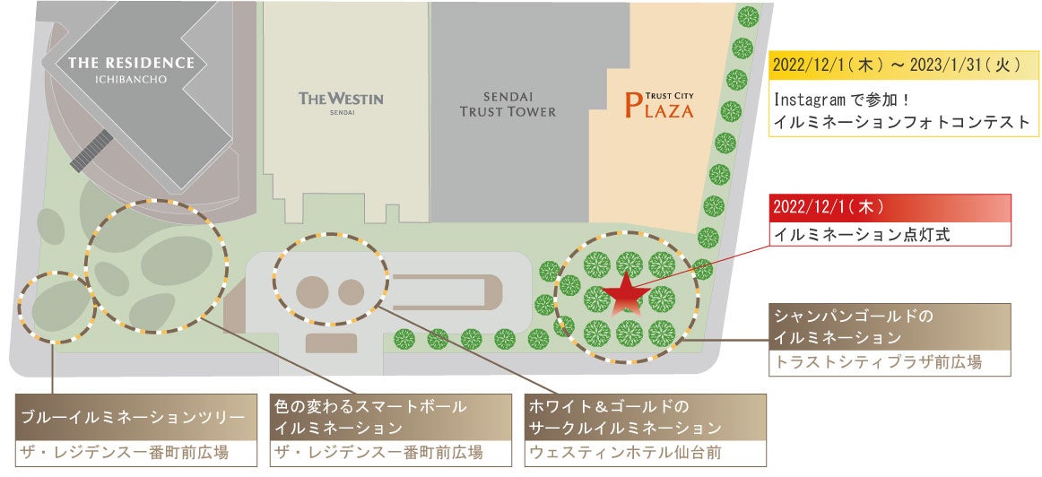 メインとなる『トラストシティプラザ前広場』では、洗練されたシャンパンゴールドのイルミネーションに宝石をちりばめたような輝きを演出するほか、今年から新たに羽をモチーフにしたイルミネーションもご用意します。また、『ザ・レジデンス一番町前広場』には、色の変わるスマートボールのイルミネーションツリーを設置いたします。注)従来と比べLED電球1球あたりの使用電力を約50%削減(2019度使用のLED電球との比較)