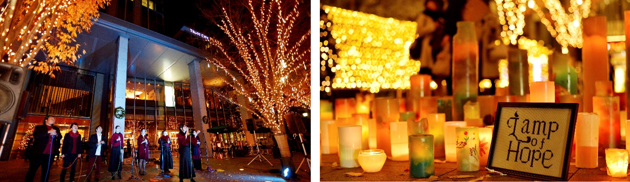 イルミネーションの点灯開始日には、ライトアップの瞬間を盛り上げる「イルミネーション点灯式」を開催します。会場が一体となって点灯の瞬間を迎えることができるよう、MCにフリーアナウンサーとして多方面で活躍されている大坂裕子さんをお迎えし、点灯カウントダウン・ゴスペルライブを行います。当日はキャンドルナイトも同時開催し、イルミネーションとともに辺りを暖かく照らします。
