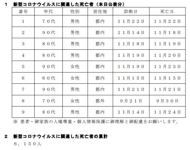 新型コロナウイルスに関連した患者の死亡について business Twitter Facebook はてブ Pocket LINE コピー 2022.11.25 この記事は約1分で読めます。 都内で新型コロナウイルスに感染した方が死亡されましたのでお知らせします。 お亡くなりになった方のご冥福をお祈り申し上げます。
