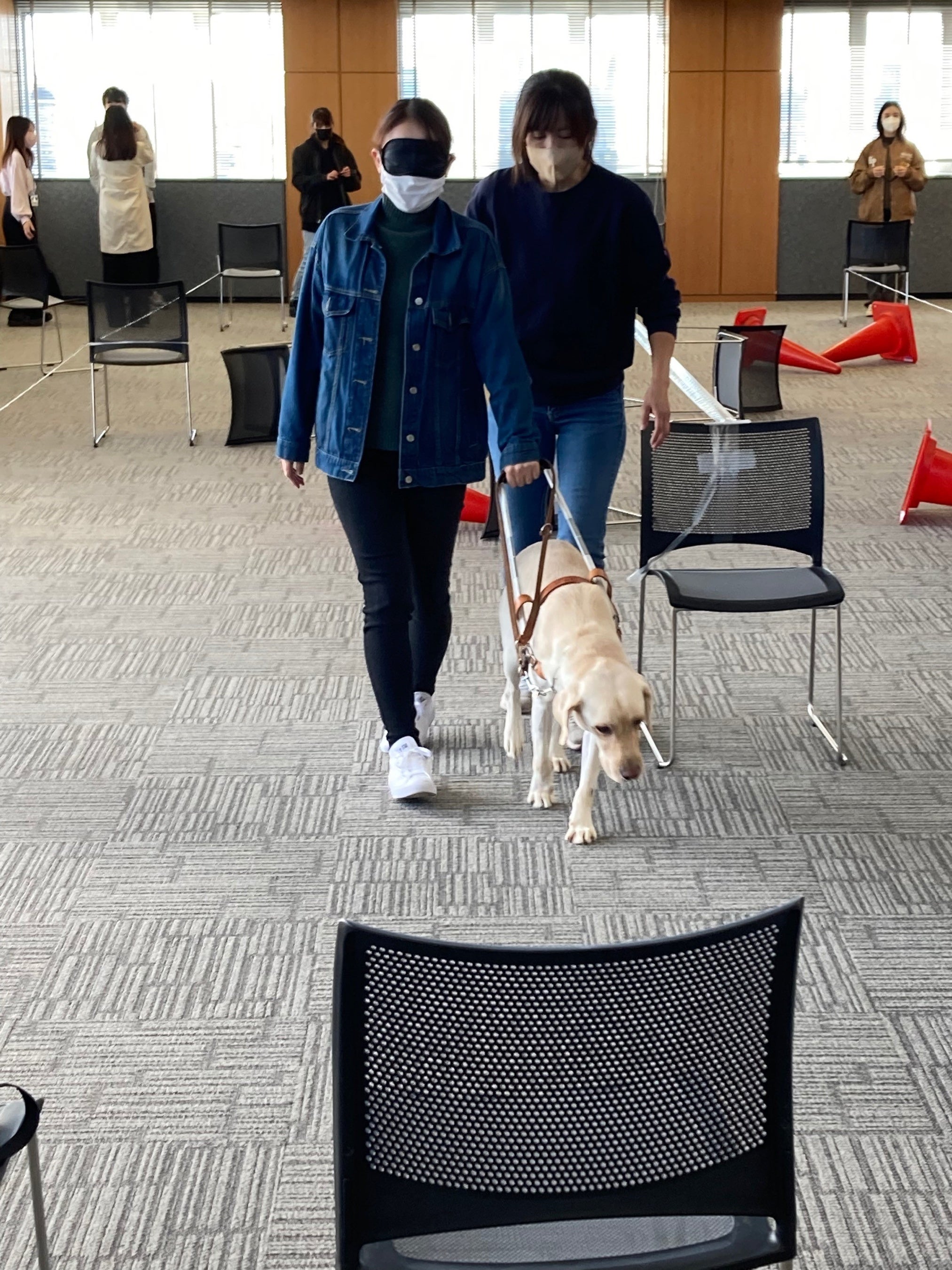 「アイメイト(盲導犬)との体験歩行」では、体験者の「気づき」につながるよう、事前にアイメイト協会の方から体験歩行をする際の注意点に加えて、視覚に障がいがあるとどのようなことが困るのか、自分たちにどんなことができるのかの問いかけをいただきました。その後、障害物を置いたコースを、目隠しをして声のみの案内で歩く体験、さらにアイメイトとの歩行を体験することで、困っているときにはどのようなことが助けになるのかを考えるきっかけとしてもらい、声かけの大切さなどを実感していただきました。