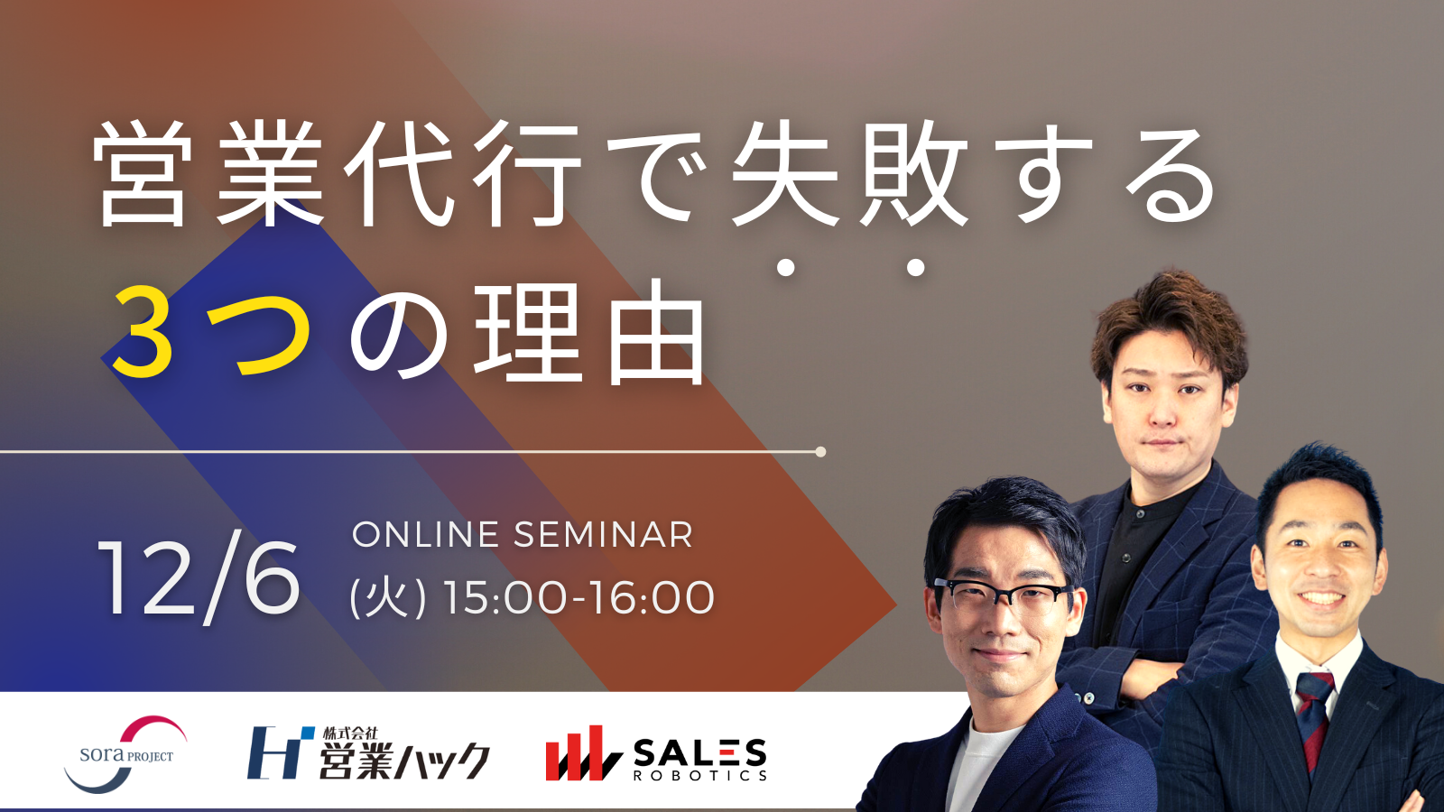 一方で「売上が3倍に伸びた」「見込み顧客が先月より増えた」といった営業代行をうまく活用して成果につながっている企業がいることも事実です。今回のセミナーでは、営業代行を主な事業とする「株式会社soraプロジェクト」「SALES ROBOTICS株式会社」「株式会社営業ハック」3社の経営陣が集まり、営業代行で失敗する条件や成功するポイントを本音で包み隠さず議論していきます。