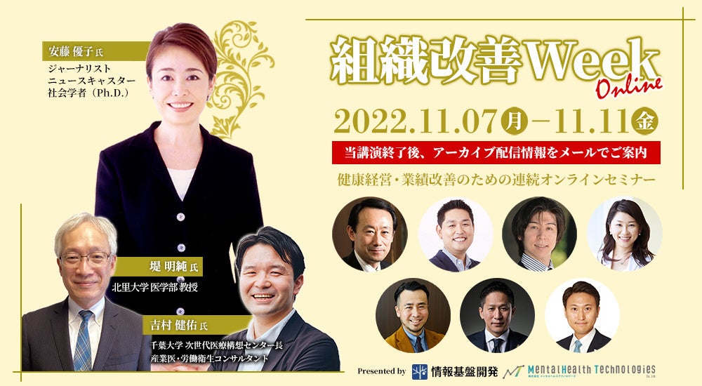 「組織改善Weekオンライン」は、ウェルビーイング、健康経営、職場環境改善、メンタルヘルス対策、働き方改革、男女共同参画、女性活躍推進、人的資本経営、ワークライフバランス(家庭と仕事の両立支援)等のさまざまな観点から“心も体も健康に活躍できる環境作り・企業業績改善につなげる”ヒントとなる識者の講演を配信するオンラインセミナーイベントです。