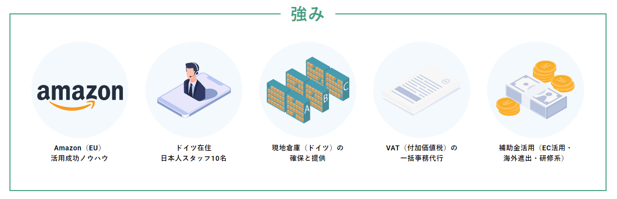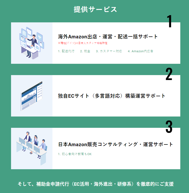 | 1.Amazonと独自ECサイトの2本立てで越境ECの展開を支援 2.Amazon販売の経験がない方も安心。日本Amazon販売から学習し、スムーズに欧州展開が可能 3.そして、補助金を活用した資金工面をサポート |