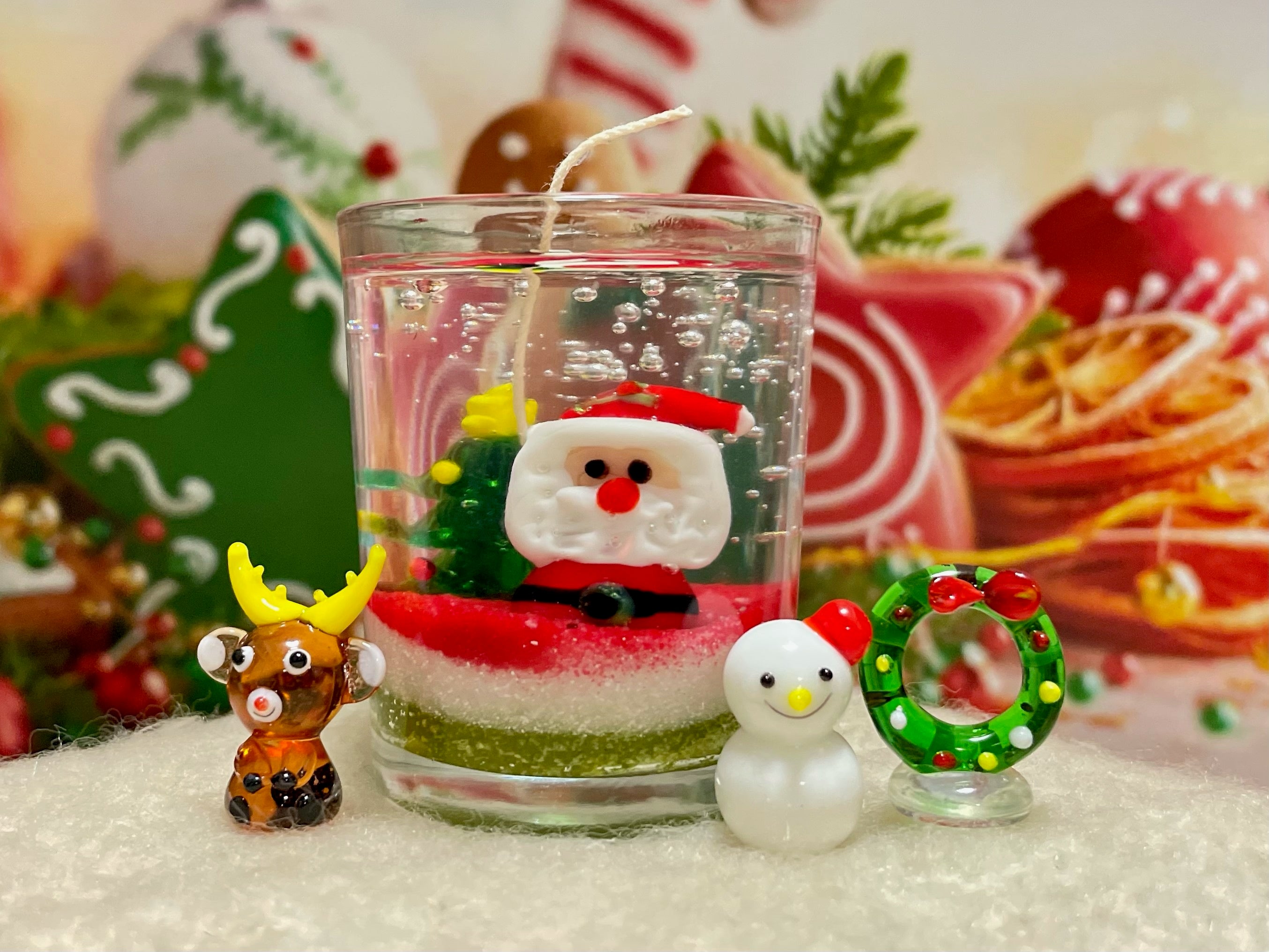 3種類のカラーサンドとガラス小物を入れ、透明なジェルワックスを流してキャンドルを作ります。