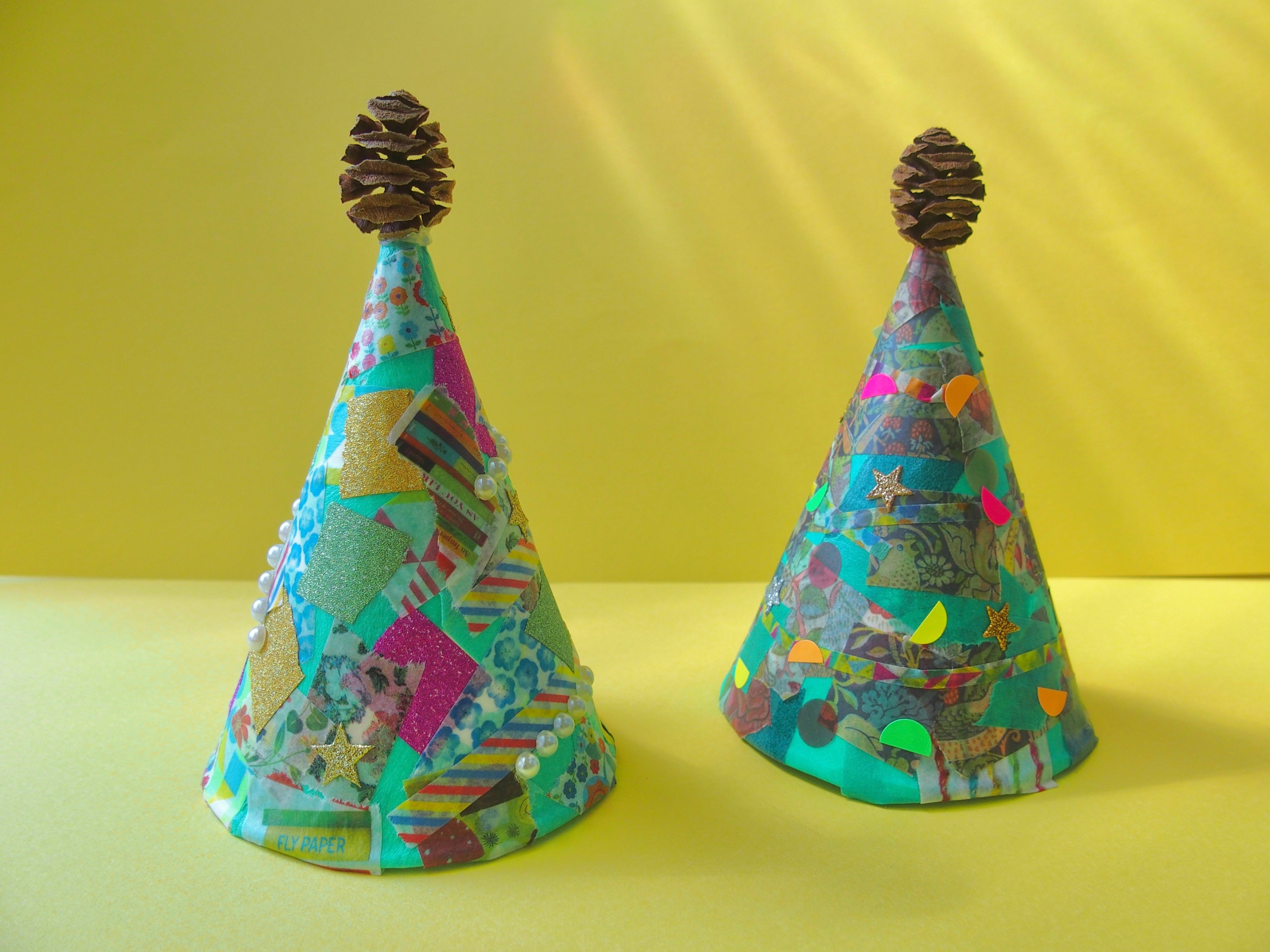 ツリー形のカップをマスキングテープやシールでコラージュし、メタセコイアで飾ります。LEDキャンドル付き。