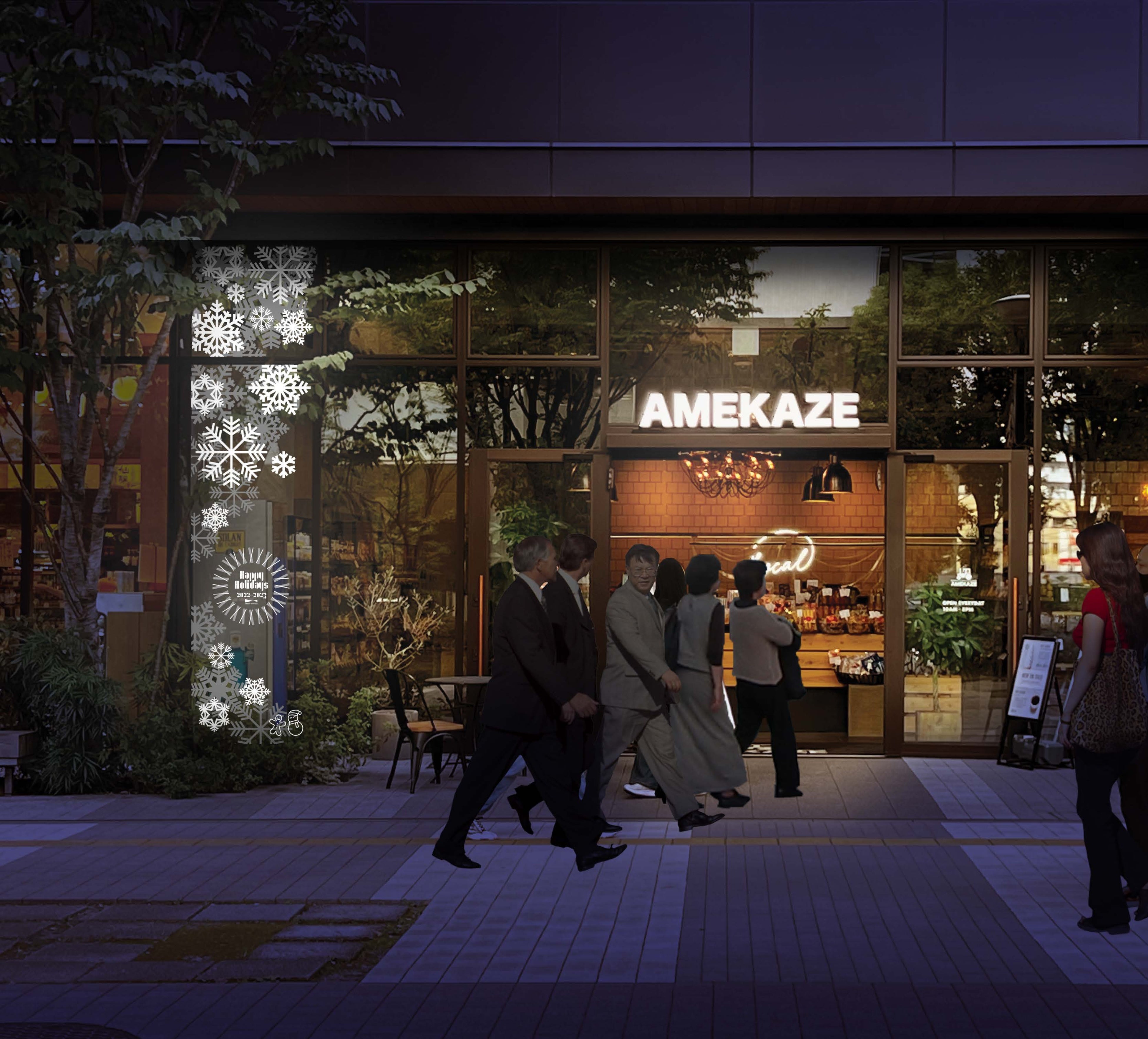 ・各店舗のガラス窓が雪空を表す『雪のカーテン』で冬の装いに!