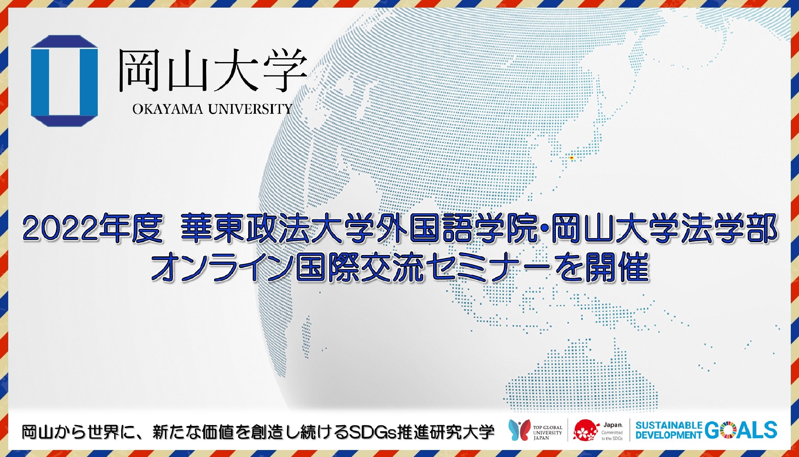 国立大学法人岡山大学(本部:岡山市北区、学長:槇野博史)の法学部は、2022年11月2日、華東政法大学外国語学院とのオンラインによる国際交流セミナーを開催しました。