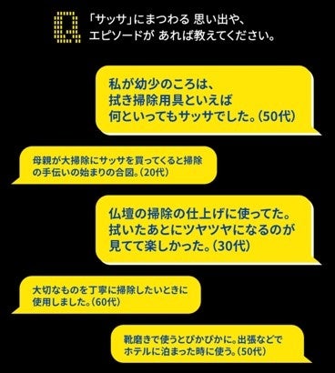 ・「サッサ」にまつわるエピソードを募集すると「幼少のころは拭き掃除用具といえばサッサだった」「子供の頃、母が仏壇やタンスを拭いていた」などロングセラー商品ならではの懐かしのエピソードが続々集まる結果に。