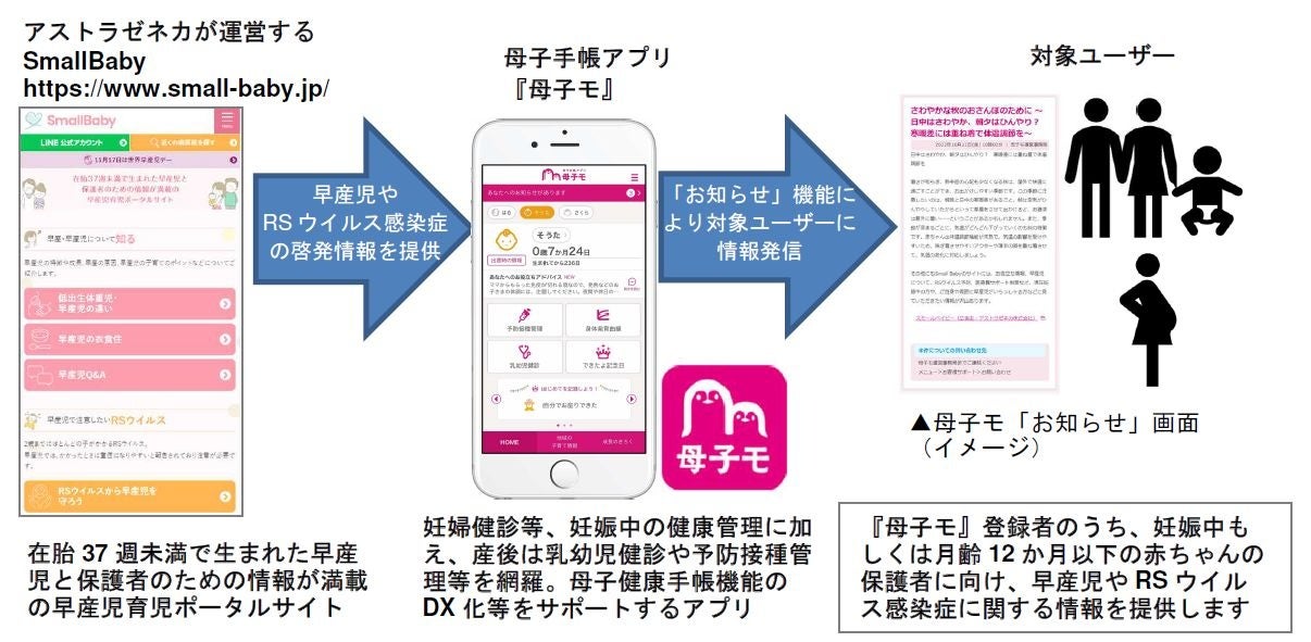 母子手帳アプリ『母子モ』登録者のうち、妊娠中もしくは月齢12か月以下の赤ちゃんの保護者に対し、アプリの「お知らせ」画面を通じて、アストラゼネカが専門医師の監修を受けて作成した早産児やRSウイルス感染症に関するポータルサイト(SmallBaby https://www.small-baby.jp/)収載の情報を発信します。