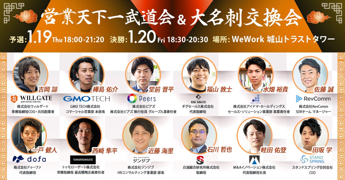 翌週1月19日〜20日に行われるリアルイベントの『営業天下一武道会』では、厳選された国内最高峰レベルの営業の猛者12名の勝ち抜きバトルを行い、営業の日本一を決める戦いをお届け。