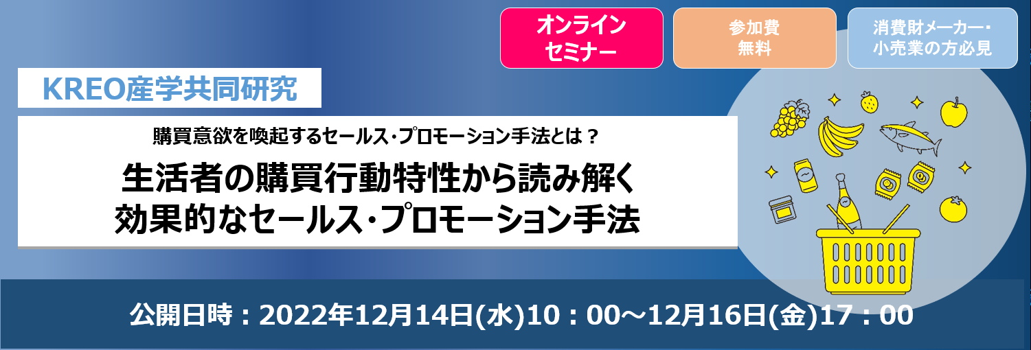 産学共同研究を基に消費者行動研究学会で発表した報告をベースに、実務に応用できるように、データの一部を再編集したウェビナーになっております。食品及び日用品の消費財メーカーのマーケティング、プロモーションに携わっている方、また小売業で販促に携わっている方必見の内容となっております。ぜひご視聴下さい。