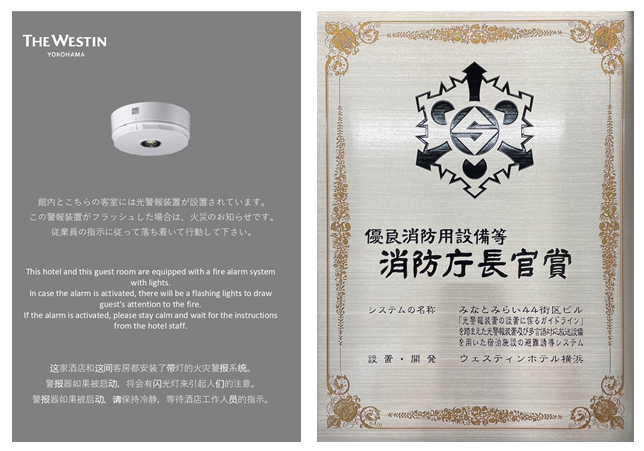 当ホテルは、お客様と従業員の安心・安全を第一に考えたマリオット・インターナショナルグループの一定の基準に基づき、火災を知らせる光警報装置と多言語対応放送設備をバリアフリー対応客室、レストラン、宴会場等館内各所に多数配備し、非常時はフラッシュライトの光で聴覚障がいのある方に何かあったことを知らせると共に、3か国語(日本・英語・中国)による火災時非常放送により、海外からの宿泊者にも素早く伝えるシステムを導入しております。