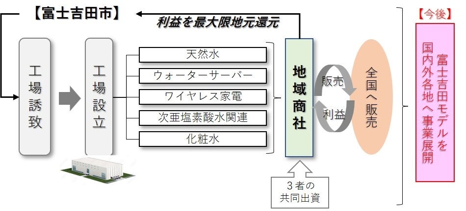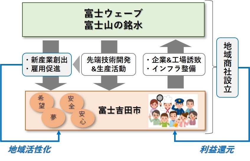 富士ウェーブと富士山の銘水が強みを持つ地元生産品を取扱商品とした、官民共同出資の地域商社を設立し、利益を最大限地元に還元する「自己完結型サイクル」を確立します。