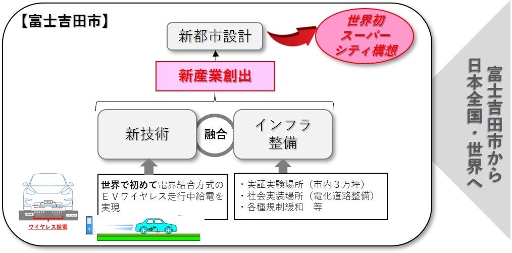 富士ウェーブが保有する「電界結合方式のEVワイヤレス走行中給電技術」と富士吉田市による「社会実装に向けたインフラ整備」を融合し、脱炭素社会に向けた新産業を創出・発展させて地域活性化を図ると共に、この富士吉田市発の産業を日本全国・世界へ展開していきます。
