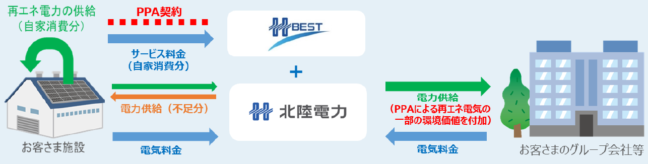 ・お客さま施設内の屋根上などに、北陸電力グループの北陸電力ビズ・エナジーソリューション株式会社(以下、北電 BEST)が、北電BEST資産として太陽光発電設備を設置し、発電した再生可能エネルギーをお客さま施設内に供給いたします。