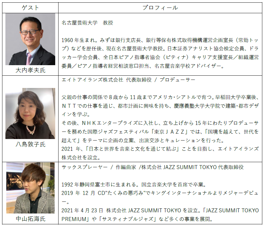 昨年に引き続きビジネストークセッションを予定しています。今年度は、「音楽教育から考える日本の未来」や「ジャズのグローバリゼーション」などをテーマに、それぞれに関する有識者をゲストにお招きしたトークセッションを、本イベントのコンテンツとして放送いたします。