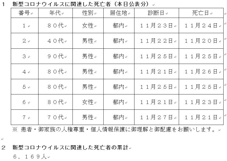 新型コロナウイルスに関連した患者の死亡について business Twitter Facebook はてブ Pocket LINE コピー 2022.11.28 この記事は約1分で読めます。 都内で新型コロナウイルスに感染した方が死亡されましたのでお知らせします。 お亡くなりになった方のご冥福をお祈り申し上げます。