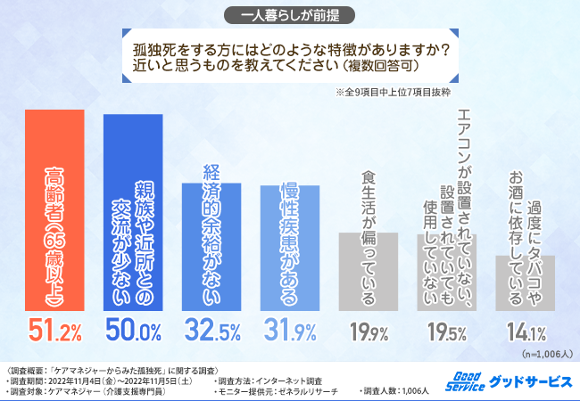 そこで今回、株式会社GoodService(https://www.kataduke-kaitori.com/)は、ケアマネジャーを対象に、「ケアマネジャーからみた孤独死」に関する調査を実施しました。