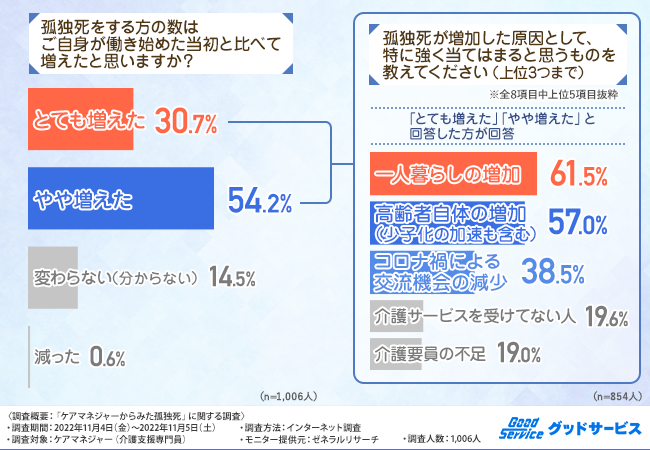 「孤独死をする方の数はご自身が働き始めた当初と比べて増えたと思いますか?」と質問したところ、『とても増えた(30.7%)』『やや増えた(54.2%)』『変わらない(分からない)(14.5%)』『減った(0.6%)』という回答結果になりました。