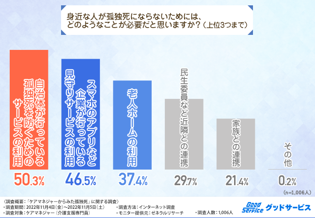そこで、「身近な人が孤独死にならないためには、どのようなことが必要だと思いますか?(上位3つまで)」と質問したところ、『自治体が行っている孤独死を防ぐためのサービスの利用(50.3%)』と回答した方が最も多く、次いで『スマホのアプリなど企業が行っている見守りサービスの利用(46.5%)』『老人ホームの利用(37.4%)』『民生委員など近隣との連携(29.7%)』『家族との連携(21.4%)』と続きました。