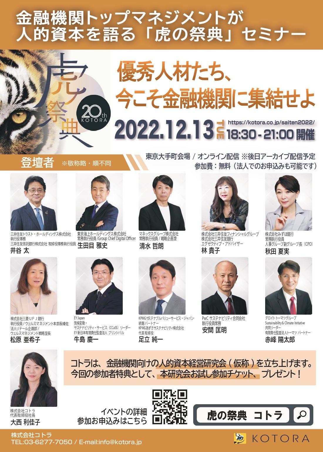 2022年12月13日(火)に、大手金融機関において第一線で活躍されるトップリーダーの方々が一堂に集結し、金融業界の人的資本経営について議論を交わす催し「虎の祭典2022〜 優秀人材たち、今こそ金融業界に集結せよ。〜」を開催します。催しは3部構成で、第1部は金融業界の変革のリアルを、第2部ではキャリア変革のリアルを、第3部では新しいビジネスを牽引するサステナビリティ・ESGをテーマに、延べ10名のゲストを迎え、コトラ代表の大西利佳子がファシリテーターとなり、変化のリアルが伝わるようにゲストのトークを引き出します。このほど、調整中だった第3部の登壇者(KPMGあずさサステナビリティ株式会社、PwCサステナビリティ合同会社、有限責任監査法人トーマツ)が決定しました。