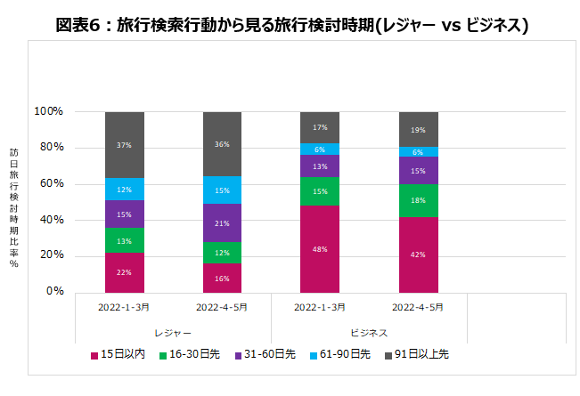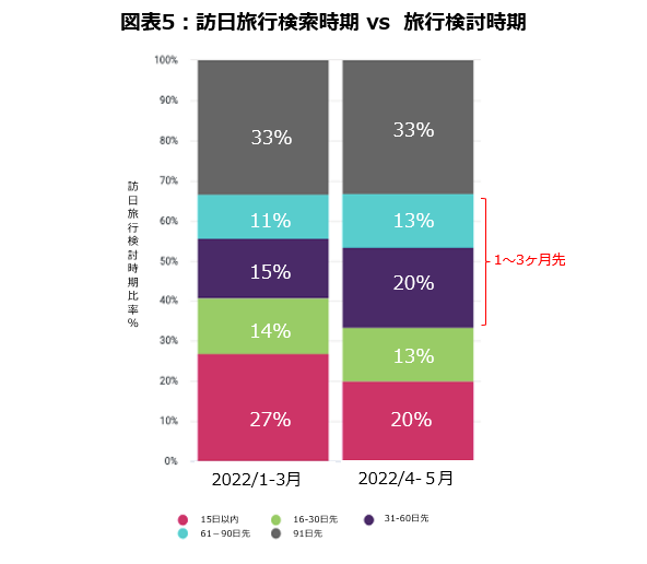 ・2022年1~3月期と比較して、直近4~5月期の検索行動では、1〜3ヶ月先の夏季シーズンをターゲットとした訪日旅行検索が増加しているのが分かります(図表5)。