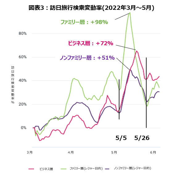 ・2022年5月5日の水際対策緩和報道を受けて、レジャー目的・ビジネス目的いずれも急速に検索数が増加しています。特にファミリー層は、同年3月初旬対比で報道後1週間は最大98%まで推移(図表3) 、予約率も平均43%と上昇しています。