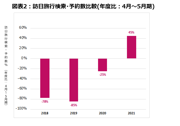 ・4月~5月の同時期検索・予約数は、コロナ前までは戻ってはいないが、2021年比較で45%増まで回復傾向です(図表2)。