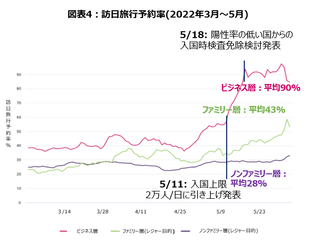 ・一方ビジネス層も同様の動きが見え、5月18日発表の入国検査免除検討の発表後、予約率が平均90%と大幅に増加しています(図表4)。
