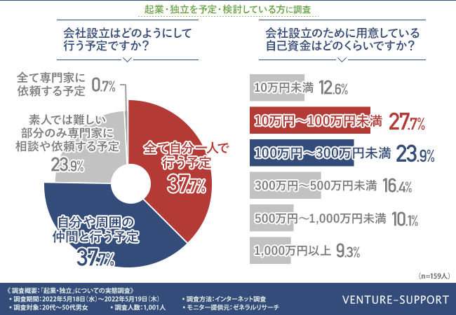 設立に際しては、「全て自分一人で行う予定」「自分や周囲の仲間と行う予定」が同数の約4割(37.7%)。