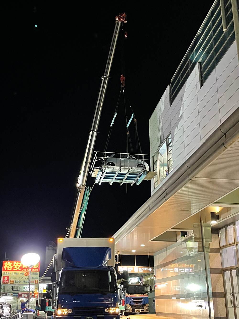9メートルの高さまでクレーンで慎重に上げたところで、駅西側のガラス窓から搬入。