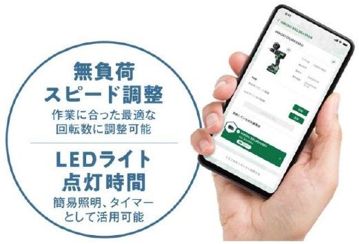 お手持ちのスマートフォンに専用アプリ「HiKOKI TOOLS」をダウンロードしてBluetooth®蓄電池を取り付けると、無負荷スピードとLEDライト点灯時間の調整ができます。