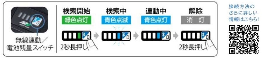Bluetooth®蓄電池の「無線連動/電池残量スイッチ」を長押しし、検索中(青色点滅)の状態でHiKOKI TOOLSアプリから接続してください。接続が完了すると、ランプが点滅から点灯に変わります。