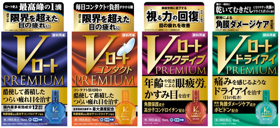 左から「Vロートプレミアム」(第2類医薬品):疲れ目・充血に、「Vロートコンタクトプレミアム」(第3類医薬品):コンタクト装用時の疲れ目に、「Vロートアクティブプレミアム」(第2類医薬品)」:疲れ目・目やにの多い時などのかすみ目に、「Vロートドライアイプレミアム」(第3類医薬品):目の乾きに