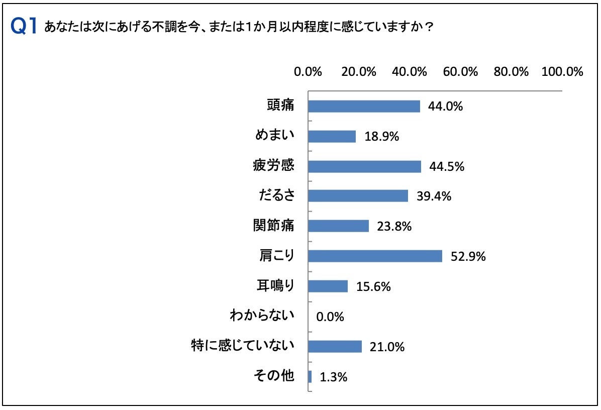 肩こりは半分以上の方が。頭痛や疲労感、だるさも多くの方が実感しています。