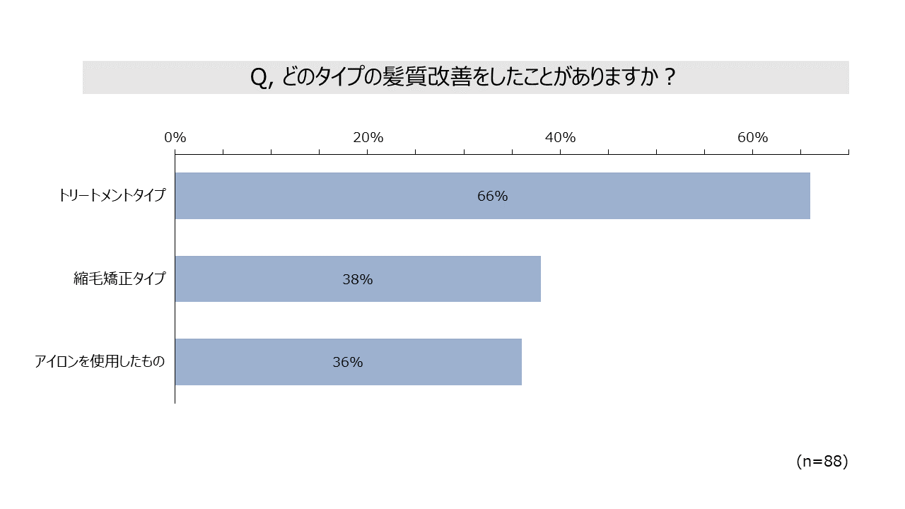 今後、髪質改善をやってみたいという方は67%、「効果がありそう」という理由から特にトリートメントタイプに興味があるようです。