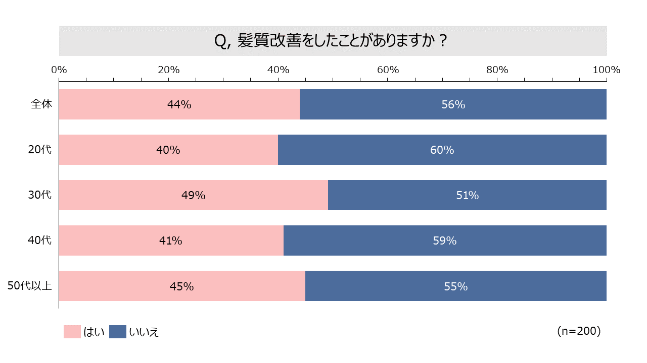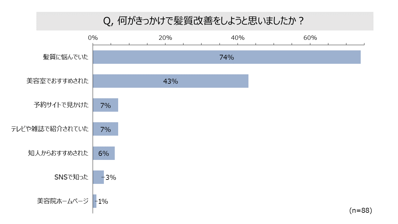 2. 44%が髪質改善を経験、きっかけは「髪質で悩んでいた」が74%