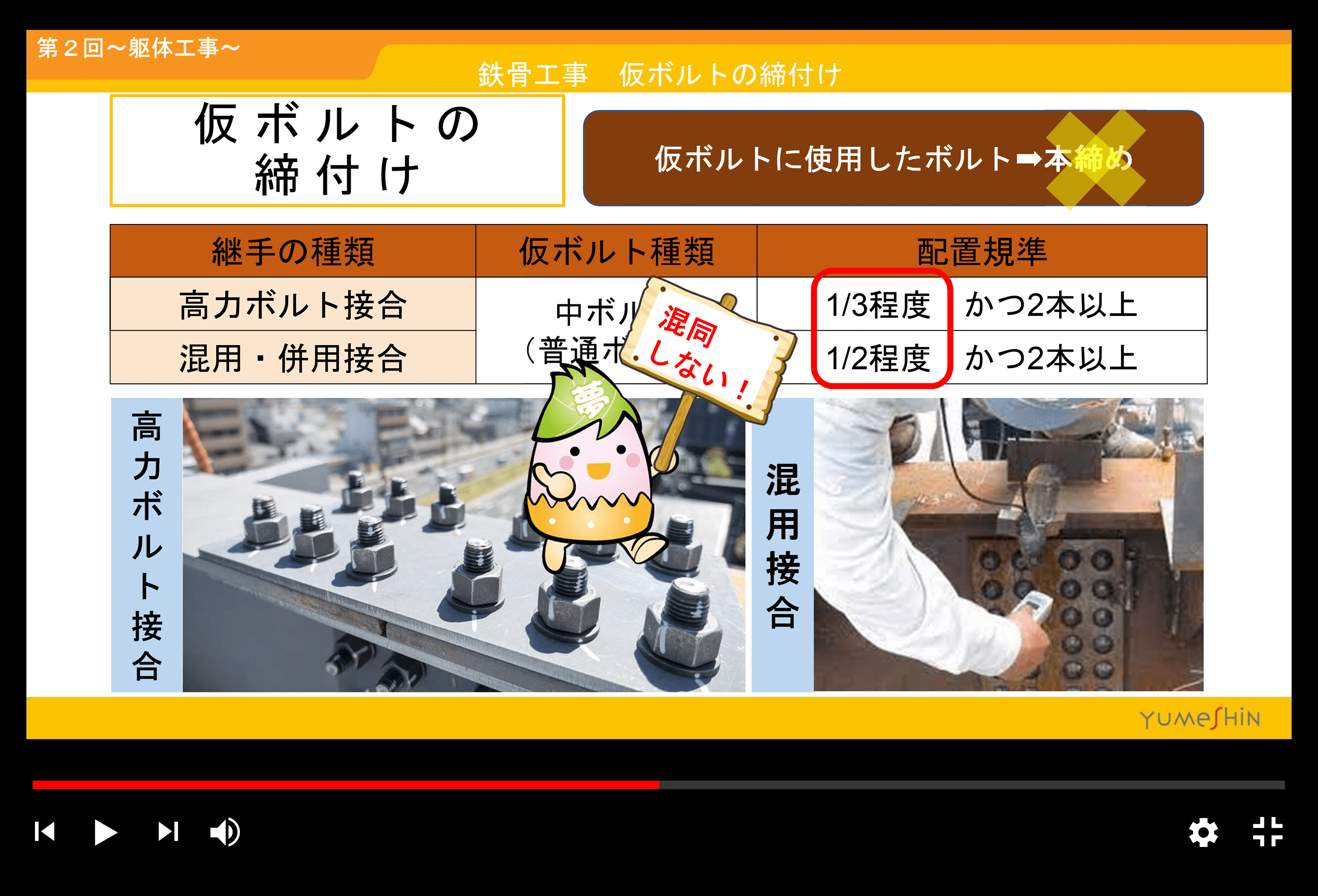 たとえば、試験でも出題頻度が高い「躯体工事」講座は最も重要な分野であり、仮設工事から鉄骨工事まで範囲も広いです。夢真は、出題頻度が高い問題分析を実施したうえで、ポイントをしぼって講座を作成しています。さらに、写真やイラストを豊富につかい、初心者にも短時間で理解できるようにわかりやすく仕上げています。