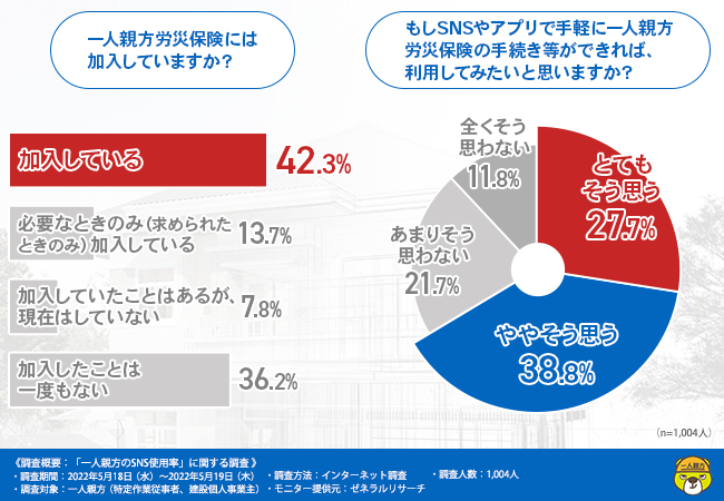 そこで、「もしSNSやアプリで手軽に一人親方労災保険の手続き等ができれば、利用してみたいと思いますか?」と質問したところ、『とてもそう思う(27.7%)』『ややそう思う(38.8%)』と約7割の方が『そう思う』と回答しました。