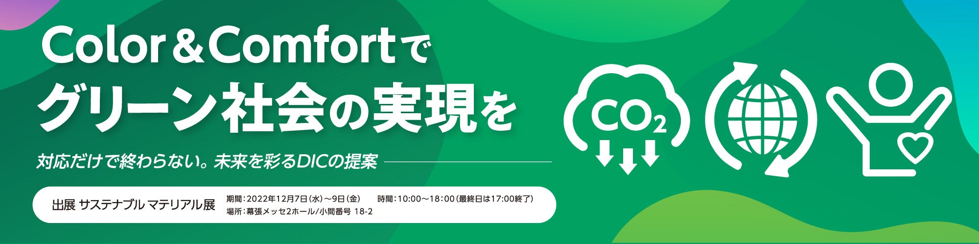 DICグループは、経営ビジョン「彩りと快適を提供し、人と地球の未来をより良いものに– Color & Comfort –」のもと、同展では、“Color&Comfortでグリーン社会の実現を“をコンセプトとして、「カーボンニュートラル」、「サーキュラーエコノミー」、「QOL(安全・健康・快適)」の3つの社会課題の解決に貢献する製品やソリューションを紹介します。