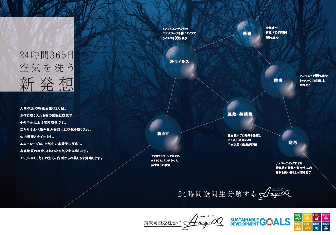 Any ∞(エニー ループ)は、繊維や壁などに噴射塗布するだけでナノレベルの分子が乾燥、強力固着し、ナノ被膜を形成し、有害物質の浄化(浄菌・浄ウイルス)、きれいな空気を生み出します。防汚・防臭・防カビの機能性も実証されています。
