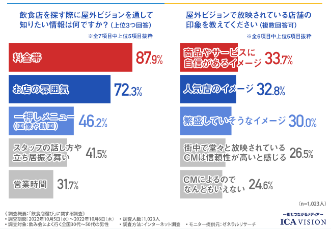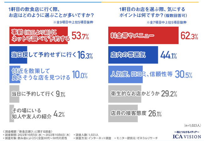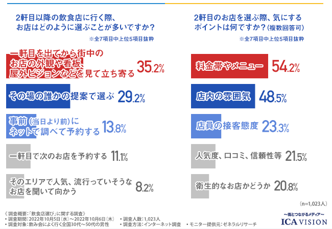 そこで今回、屋外ビジョン「ICAビジョン」(https://www.icavision.com/)を開発・販売する株式会社ICAは、飲み会によく行く全国30代~50代の男性を対象に、「飲食店選び」に関する調査を実施しました。