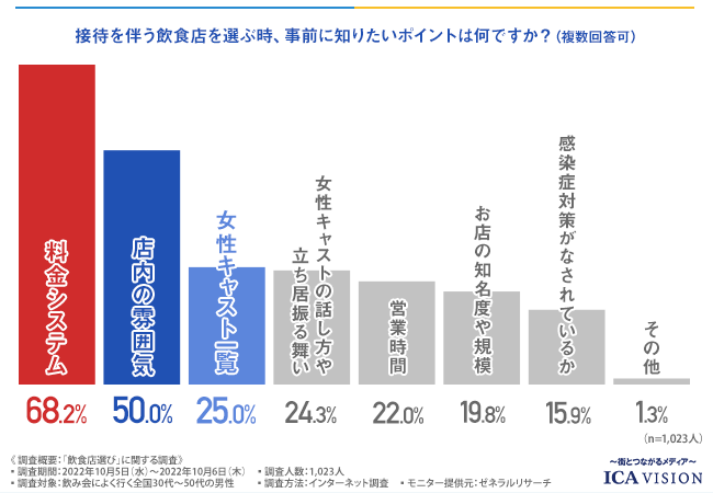 特に、接待を伴う飲食店選びでは「店内の雰囲気」が50.0%と増え、「料金システム」の68.2%に次ぐ高さとなりました。