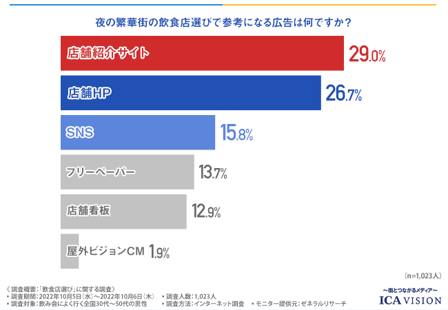 そこで、「夜の繁華街の飲食店選びで参考になる広告は?」と質問したところ、『店舗紹介サイト(29.0%)』と回答した方が最も多く、次いで『店舗HP(26.7%)』『SNS(15.8%)』『フリーペーパー(13.7%)』『店舗看板(12.9%)』『屋外ビジョンCM(1.9%)』と続きました。
