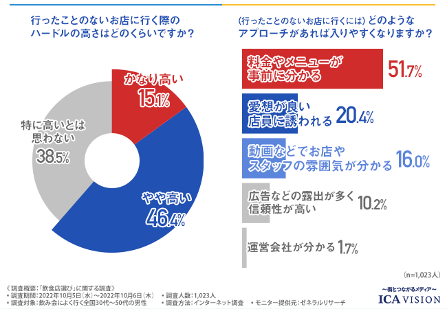 そこで、「行ったことのないお店に行く際のハードルの高さはどのくらいですか?」と質問したところ、『かなり高い(15.1%)』『やや高い(46.4%)』『特に高いとは思わない(38.5%)』という回答結果になりました。
