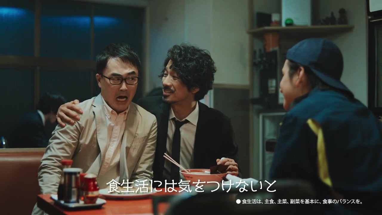 CMでは、刑事役の眞島秀和さんと鑑識役の中島健さんが町中華に出動。ラーメンを食べようとするお客さんに対して、糖質90g脂質13gと瞬時に見立て、ハマってしまう美味しさと食生活について気を付けるようアドバイスし、食事の糖分や脂肪が気になる方に「賢者の食卓 ダブルサポート」を活用して賢く食べることを提言します。市民の健康的な食生活を守るため、ワイルドさと優しさを持った刑事を眞島秀和さんが熱演します。