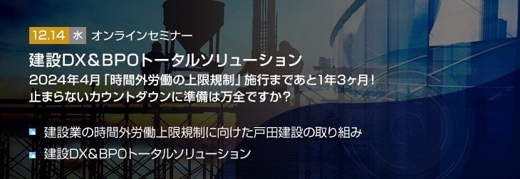本セミナーでは、戸田建設様より時間外労働上限規制に向けた、デジタル化、効率化の取り組みをご紹介いただきます。