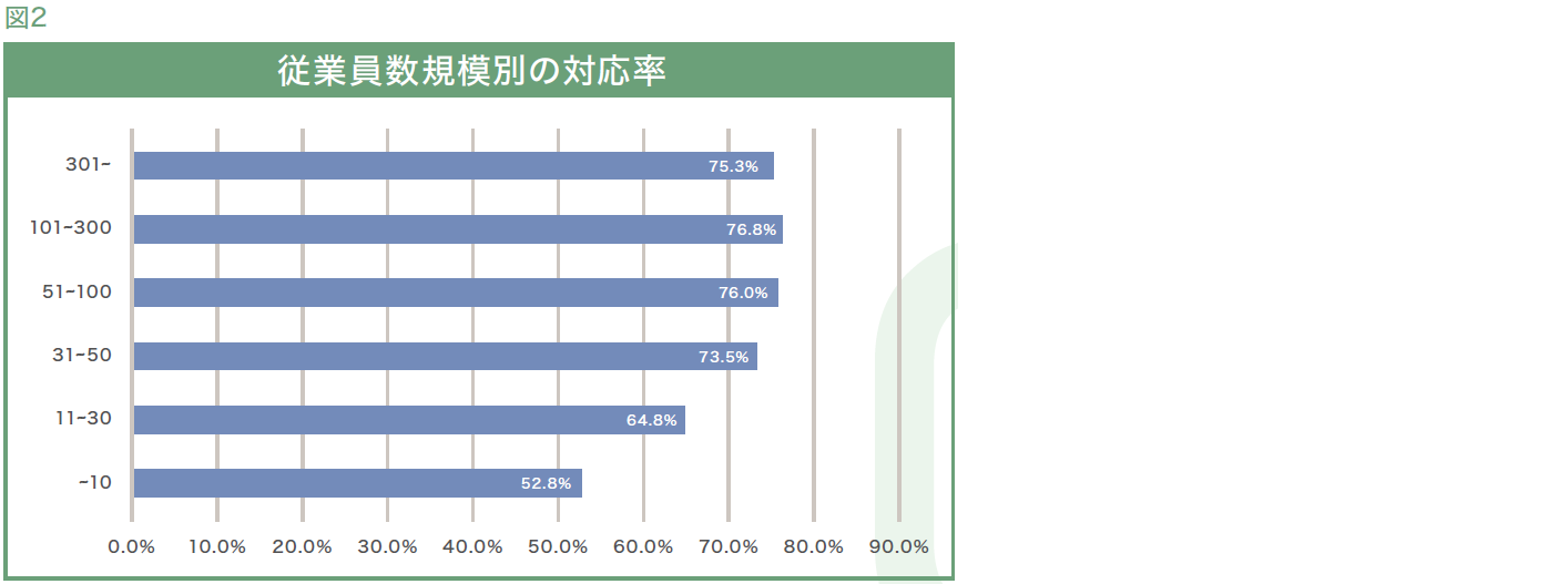 は高くなる傾向にあると言われている。表3にある通り、今回のアンケート結果でも基本的には従業員数が多くなればなるほど、対応済みの割合が高い。一方で従業員が10名未満の企業群は他と比較して数値が極端に低くなって