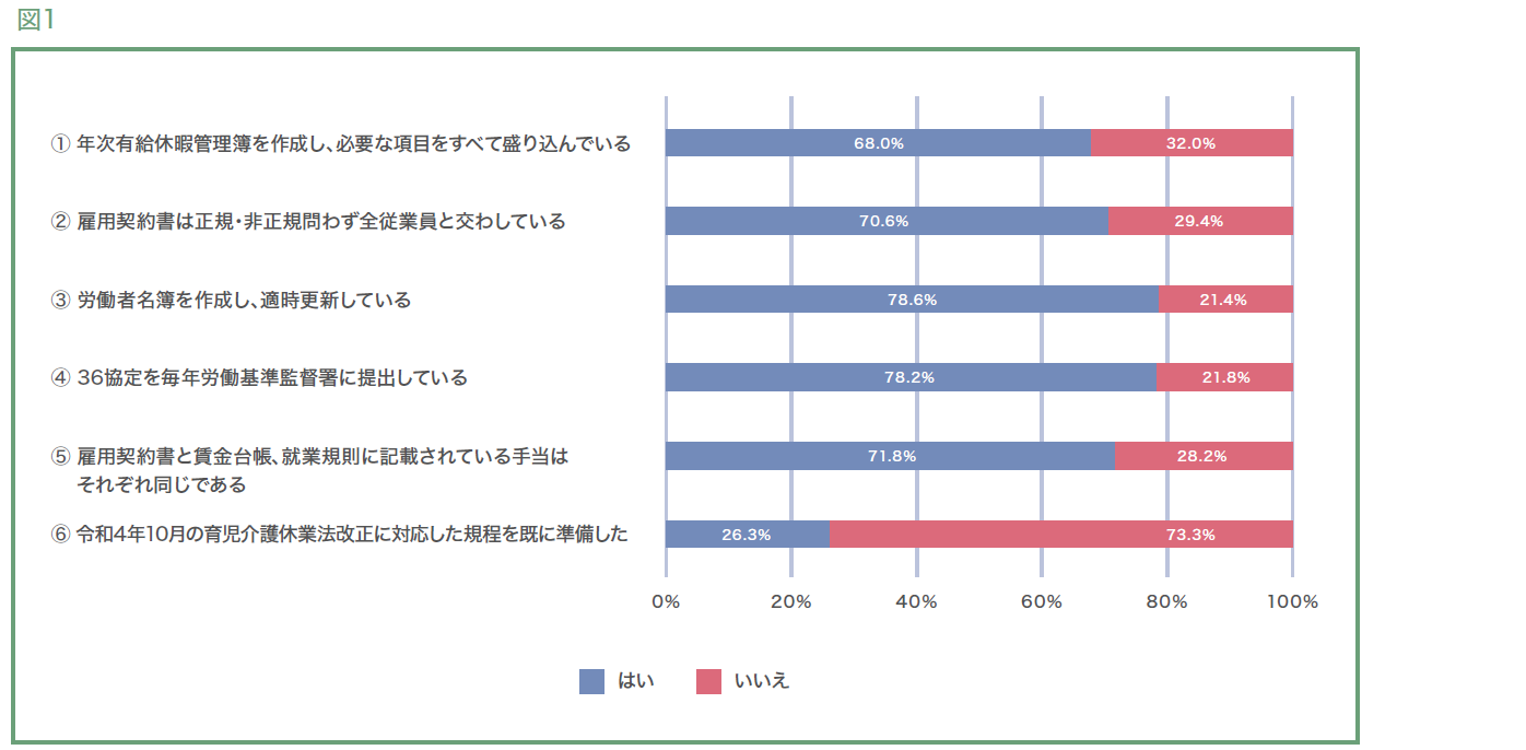 いるが、それでも全設問の対応率を平均した数値では50%を超えており、小規模事業者は労務整備ができていない