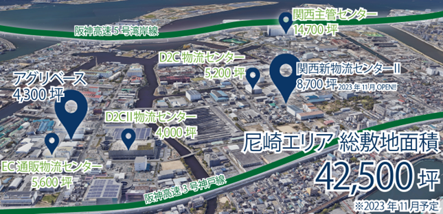 尼崎エリアでの総面積は33,800坪となり、来年2023年11月開所予定の「関西新物流センターⅡ(仮称)」が
